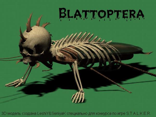 Авторы: LeshiY&SeniyaK e-mail:senyak2@yandex.ru Адрес: г.Тверь, ул.Георгиевская, д.10, кв.37 Телефон: (0822)48-44-93 1.Подробное описание внешнего вида монстра. - Уродливое создание - смесь скелета человека и таракана.Тело таракана находится внутри человеческой грудной клетки и защищено рёбрами, как панцирем. Позвоночник деформировался и образовал ряд шипов. Голова таракана с мощными челюстями накрыта человеческим черепом, как шлемом. Череп насквозь пробит шипами, растущими из головы таракана. Глаза таракана совпали с глазницей. Передняя пара лап срослась с руками, они образовали мощные и цепкие конечности. Остальные лапы не изменились. (К письму прилагается наглядный пример: картинки и 3D модель, сделанная в 3D Studio Max.) 2.Подробное описание способа передвижения монстра. - Данное существо - Blattoptera (от лат. "таракан", или сокращённо - Blatto) перемещается по полу, потолку, стенам. При движении Blatto отталкивается задними тараканьими лапами и подтягивается вперёд человеческими руками. Умеет ходить, бегать, прыгать. 3.Подробная информация о повадках создания, местаз его обитания. - Обитает в зданиях, прячется в тёмных местах: в углах (на потолке), за предметами, в закоулках, дырках, в туалетах. 4.Подробная легенда монстра. - Как известно тараканам не умирают от больших доз облучения, а накапливают её в своём теле. После второй аварии тараканы, облученные при первом взрыве, получили ещё большую дозу радиации, но не погибли ,а стали видоизменяться. Эти тараканы, в отличие от обычных, стали откладывать яйца в телах погибших людей. Личинки питались внутренностями "хозяев",вырастали до огромных размеров и разрывали трупы изнутри. Получалась этакая тварь-смесь человека и таракана. 5. Подробная информация о способах взаимодействия монстра с другими персонажами зоны. - Очень агрессивен и почти всегда голоден, атакует любой живой объект попавший на его территорию. 6.Подробная информация о боевой тактике монстра, о том, как он ведёт себя во время взаимопротивостояния с врагом. - Blatto сочетает в себе ум человека и повадки таракана. Известно, что тараканы очень сообразительны: если цель опасна или недоступна с земли, то они ползут по стене на потолок в точку над жертвой и затем прыгают на неё. Затем Blatto, хватая жертву руками, кусает её челюстями в шею, пытаясь перекусить позвоночник и парализовать врага. 7. Подробная информация о том, как боротся с монстром, о способах его победы и методах его отлова и уничтожения. - Blatto как и тараканы очень живучий. Если обычному таракану отрезать голову, то он через 6 дней умрёт от голода. Поэтому, чтобы победить Blatto его надо либо обездвижить (отрезав лапы, раздавив его), либо сжечь, либо ударить разрядом эл. тока и, конечно, можно усыпить. |