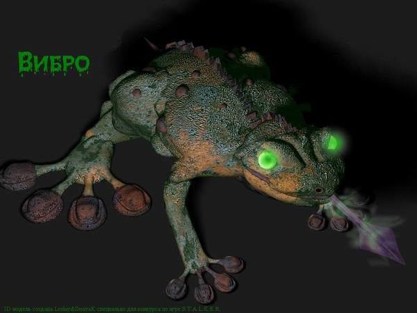 Авторы: LeshiY&SeniyaK (Олег и Семён Шеховцовы) Адрес: г.Тверь, ул.Георгиевская, д.10, кв.37 Телефон: (0822)48-44-93 e-mail:senyak2@yandex.ru 1.Подробное описание внешнего вида монстра. - Вибро - это огромная лягушка, задние лапы и перепонки на них увеличены, хвост иглообразный, глаза остекляневшие, не моргают, светятся в темноте, язык напоминает стрелу. (К письму прилагается наглядный пример: картинки и 3D модели, сделанные в 3D Studio Max.) 2.Подробное описание способа передвижения монстра. - Вибро передвигается пешком, бегом, но, в отличие от обычной лягушки, не умеет прыгать. При движении он переваливается с боку на бок, кавыляет. 3.Подробная информация о повадках создания, местаз его обитания. - В качестве мест для обитания Вибро выбирает тихие, тёмные места, причём не обязательно поблизости от воды. Часто живёт рядом с другими обитателями Зоны, чтобы те заставляли жертву двигаться, и Вибро её чувствовал. 4.Подробная легенда монстра. - Лягушки в городе и окрестностях питались радиоактивными насекомыми и выросли до огромных размеров, лапы у них стали ещё больше, на них развились перепонки, чувствительные к колебаниям земли. Кожа приобрела способность улавливать любые колебания: выстрелы, шум шагов, речь и т.д. По вибрации почвы и воздуха (отсюда и название монстра) они научились определять всю необходимую информации о жертве: её местоположение, размеры, скорость и т.д. Зрение и слух атрофировались. Так и получился Вибро. Вибро, в отличие от обычной лягушки, - не земноводное, поэтому не зависит от воды. Глаза ему теперь были не нужны, он их использовал лишь для устрашения и приманивания врага, а ориентировался только с помощью лап и кожи. Вскоре язык Вибро принял форму стрелы, развились мышцы, позволяющие его резко выстреливать метра на три, поражая жертву. 5. Подробная информация о способах взаимодействия монстра с другими персонажами зоны. - Если Вибро поселится рядом с кем-нибудь из обитателей Зоны,то он может ипользовать их для того, чтобы те заставляли Сталкера двигаться (бежать, шуметь). Если же Вибро голоден, то может съесть (если удастся) и соседа-помошника. 6.Подробная информация о боевой тактике монстра, о том, как он ведёт себя во время взаимопротивостояния с врагом. - Вибро использует светящиеся глаза, чтобы привлечь жертву, заставить её приближаться или начать убегать, одним словом, заставить двигаться. Ведь именно тогда, чувствуя её по дрожи земли, по шуму, Вибро может атаковать. Настигнув врага он ранит его мощным языком пока не убивает, а затем пожирает. 7. Подробная информация о том, как боротся с монстром, о способах его победы и методах его отлова и уничтожения. - Оружие Вибро - мощный язык, нескольких ударов достаточно, чтобы убить жертву, поэтому к монстру лучше вообще не приближаться. А если всё же необходимо пройти мимо, то перемещайтесь ползком, медленным шагом, не шумя, не стреляя без необходимости. Чтобы победить Вибро надо либо, заметив издалека, расстрелять его из дальнобойного оружия, пока тот будет приближаться. Или же если Вибро всё-таки близко от вас, то не палите в него, а замрите и медленно и тихо уходите, ведь если вы не будете шуметь, то Вибро не почувствует вас и перед самым своим носом. |