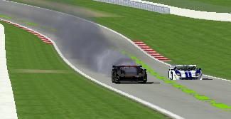 Мигающего 46 заносит прямо перед 43, который тормозит, несильно пинает OS в бок и после маленького заноса продолжает ехать дальше. |
