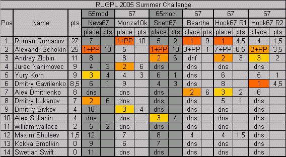 Как неофициальный зачёт, ничего против не имею, но лишь как неофициальный... В наших силах придать этому официальный статус. Я скачал с сервера все Complete.txt по нашим летним гонкам, реплеи еще перекачиваются. Согласуем и добавим к сгенерированной RA информации поправки (потеря сервером, правила с ШР... насчет штрафов там видно будет, но по прошедшим гонкам я пока не чувствую серьезной необходимости...) - и почему бы не придать сделанной на этой основе таблице официальный статус? Но мне еще кажется, что в подобных турнирах (Challenge) особый упор следует делать на победу в каждой отдельной гонке - они все полностью уникальны, у каждой свои непредвиденные трудности, победа в каждой - подвиг своего особого рода. (В частности, неплохо бы выделять в таблице и Place победителя, и имена тех, кто имеет хотя бы одну победу). Сумма очков в таком турнире, как показало лето-2004, - это показатель не только скорости, но и уровня интереса к участию в турнире в целом. |