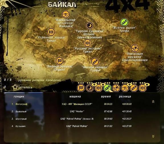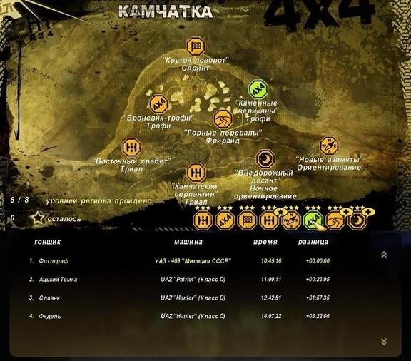 режим:Симулятор Трасса: Суперчемпионат/Камчатка/"Каменные великаны" Трофи Авто:УАЗ-469 "Милиция СССР" (полный тюнинг)КПП Автомат игровое устройства:Руль время прохождения:8.35.59 ![]() версия игры: 1.3 бета режим:Симулятор Трасса: Суперчемпионат/Байкал/"Взятие высот" Трофи Авто:УАЗ-469 "Милиция СССР" (полный тюнинг)КПП Автомат игровое устройства:Руль время прохождения:5.51.96 ![]()