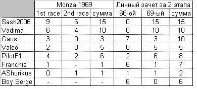 Представляю вам таблицу за этап в Монце и за оба этапа. Отдельно 66-ой, отдельно 69-ый, и общий зачет.