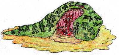 Автор: Lider 1. Подробное описание внешнего вида монстра. Внешне походит на своего собрата "огородного слизня", но вследствие взрыва, повлекшего облучение и мутацию, имеет превосходящие размеры своего сородича и наделен дополнительными развившимися способностями. ![]() Дышит легкими, расположенными в дыхательной полости сзади головы. Эта полость прикрыта сверху хорошо заметной овальной кожей-мантией. На правой стороне мантии, ближе к концу ее находится дыхальце, которое с каждым вдохом и выдохом заметно открывается и закрывается. Окраска слизня волнисто-пятнистая. Все тело его покрыто липкой слизью. На переднем конце головы слизня размещены три пары щупалец. На более длинной паре расположены крошечные глаза. Таким образом, эти щупальца являются одновременно и органом осязания и органом зрения. Раковины у слизня нет, но под мантией находится ее известковый остаток в виде пластины, которая вследствие мутации приобрела довольно серьезную прочность и способна хорошо противостоять среднему по мощности оружию. Правда, и сам слизень не такой уж безобидный субъект. Своей роговой нижней челюстью, находящейся под небольшим ротовым отверстием, и хитиновой пластиной с многочисленными зубчиками, расположенной на дне ротовой полости, он способен без каких либо затруднений разгрызать костную ткань диаметром около 20 см. Одной из приобретенных способностей являются слюнные железы, которые способны вырабатывать жидкость, по своему составу сходную с высококонцентрированной соляной кислотой. Железы опутаны мощной мускулатурой, которая при необходимости способна резко сокращаться, выбрасывая слюну на расстояние до 15 м. Состав слюны: концентрированная соляная кислота, причиняющая жертве сильные ожоги, ферменты, оказывающие влияние на центральную нервную систему, а именно - временный паралич, потеря ориентации в пространстве. Время воздействия ферментов зависит от расстояния выстрела слюной, чем дальше выстрел, тем меньше время воздействия. Второй особенностью являются щупальца. В результате мутации произошло ухудшение зрения, но взамен этого, щупальца приобрели способность реагировать на теплоту потенциальной жертвы и ее движения. В итоге, имея не очень хорошее зрение, моллюск с лихвой компенсирует это приобретенными способностями. Длина в спокойном состоянии составляет 2 м. 2. Подробное описание способа передвижения монстра. Передвигается монстр ползком, как и полагается обычному слизню. Обычно сидит, съежившись, но при передвижении вытягивается и достигает длины 4 м. Максимальная скорость во время движения 5 км/ч. Хорошо себя чувствует на отвесных гладких поверхностях. 3. Подробная информация о повадках создания, местах его обитания. Встречается на лугах и в лесах. Этот моллюск является типично наземным животным. Как и все легочные моллюски, слизень - гермафродит. Одна особь откладывает до 20 яиц порциями по 5-10 штук. Обычно это делается под сырыми листьями, на нижней стороне полусгнивших досок, в подвальных помещениях и т. д. Развиваются яйца 3-4 дня. К теплу слизни не очень требовательны, но влажность - обязательное условие их нормальной жизнедеятельности. 4. Подробная "легенда" монстра. После разрушения АЭС и выпадения кислотных дождей в близ лежайшие районы, начались необратимые изменения во флоре и фауне. Многие организмы просто по