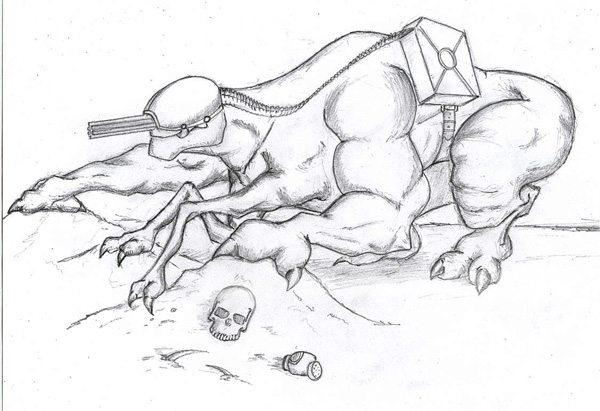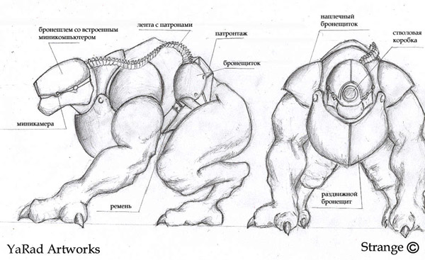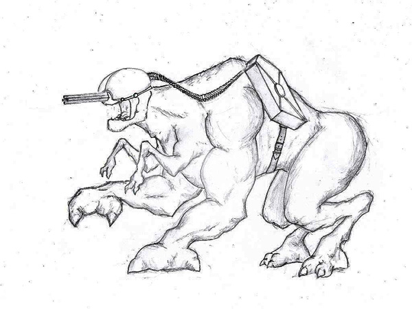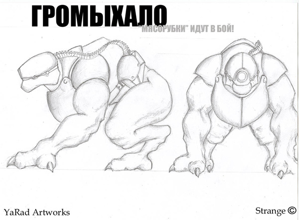 автор: Aleksandr D. Rad-X 1. Подробное описание внешнего вида монстра (желательно было бы даже предоставить скетч, рисунок или иной визуальный материал). Громыхало представляет собой хордовое животное, имеющее череп, семь шейных позвонков, спинной позвоночник-горб. Не имеет хвостовой конечности. Существо очень мускулисто и имеет массу 800 килограмм. Рост существа составляет 195 сантиметров. Длинна - 220 см. Тело покрыто уплотненной, как у слона, сероватой или бурой кожей. Имеет двупальцевые четыре лапы с когтями для передвижения. Также две лапки (рудементальные конечности) находятся на брюшной части. На шее имеется металлический ошейник. От ошейника отходит вниз грудной бронелист, загибается и немного прикрывает грудь снизу. Так же от ошейника идут наплечные листы брони, не доходя до передних лап, но прикрывая плечевые суставы (щитки-латы, подвижно соединены с общим щитком). Также на артах вы можете видеть вид, без щитков. Также имеются маленькие подвижные щитки-латы, присоединены к общему переднему щитку, над суставами рудиментарных лапок. На голове имеется бронированный шлем (правильней сказать система наведения). Голова заканчивается очень прочным и мощным клювом, которым Громыхало может разорвать даже не очень толстое листовое железо (вид без оружия скоро будет). Громыхало как бы одет в бронежилет. При нахождении близкой цели которую можно достать и разорвать лапками, щитки подымаются и не мешают, а когда лапки спрятаны, опускаются и защищают суставы. Боекомплект в контейнере на левом боку. Спереди к нему приварен бронещиток, немного шире самого контейнера. Передние лапы, спереди, на верхней 1\3, защищены бронированными щитками. Половых органов, монстр не имеет, по причине своего происхождения. В голову, а точнее в бронешлем встроен миникомпьютер. Информация от нейросетей мозга поступает в миникомпьютер, который приводит в действие шестиствольный пулемет. 2. Подробное описание способа передвижения монстра. Громыхало передвигается как бегом, так медленным шагом. Скорость его колеблется от полутора до шести километров в час. Умеет ползти, а также прыгать на средние расстояние (примерно пять-шесть метров). Пройтись по болотистой местности для него не составит труда, а вот в лесу, да уж тем более в буреломе, ему будет трудновато. Чтобы пройти по лесной местности он сшибает деревья стоящие у него на пути. При беге пользуется когтями как зацепкой за землю для разгона и торможения. 3. Подробная информация о повадках создания, местах его обитания. Громыхалы обычно обитают в комплексе, хотя спать могут и на открытой местности. В Зоне можно встретить Громыхало как в одиночестве так и целое стадо Громыхал, в котором бывают от 2 до 5 особей. Охотятся, в основном, стадом или отходят друг от друга на небольшое расстояние - 20-25 метров. Далеко от комплекса не отходят. Громыхалы снабжено массой рефлексов. Пример: если боекомплект равен 1\4, подается звуковой сигнал и зверь возвращается в “гнездо”, заходит на спец. платформу с заряжающим и кормящим устройством. После перезарядки патронами и завершения процедуры кормления опять следует звуковой сигнал и зверь уходит из гнезда. От мест с сильным радиационным фоном держится подальше. Почти всегда отдыхают стадом, редко по одному. Питаются Громыхалы свежим мясом, к падали никогда не притронутся. 4. Подробная "леге