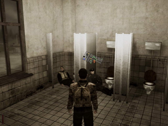 Сначала направляемся к Главному зданию. Заходим через главный вход и, не обращая ни на кого внимания (обычный солдат не должен находиться в здании для офицеров), забегаем по лестнице на 3-й этаж. Проходим через дверь и двигаемся до конца коридора. Заходим в туалет и прячемся за открытую дверь. С наганом в руке дожидаемся летчика. Как только он зайдет в кабинку туалета, закрываем входную дверь и ликвидируем выстрелом в голову. Относим тело в дальнюю кабинку у окна и укладываем так, чтобы ноги не торчали при закрытой двери кабинки. Затем зайдет офицер (при полном параде и в фуражке) и остановится у мусорницы покурить. Метким выстрелом в голову отправляем на тот свет. Относим офицера в среднюю кабинку (условия те же, что и в случае с летчиком). Переодеваемся в форму летчика. Уходя из туалета, обязательно закрываем двери двух ближних к окну кабинок. |