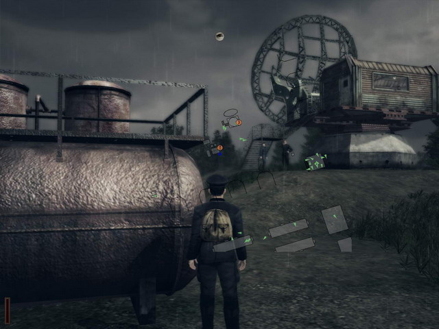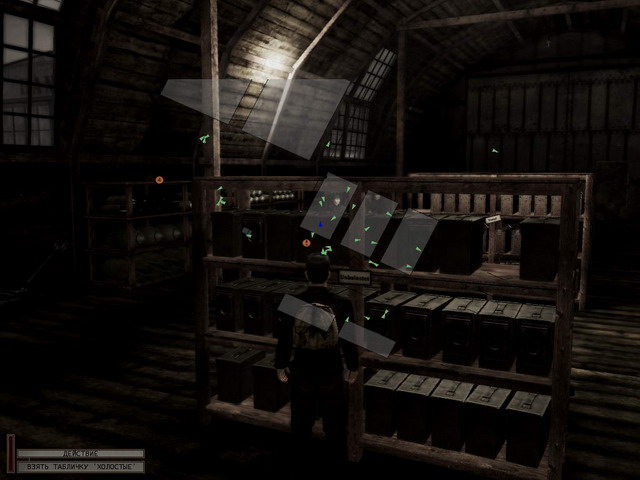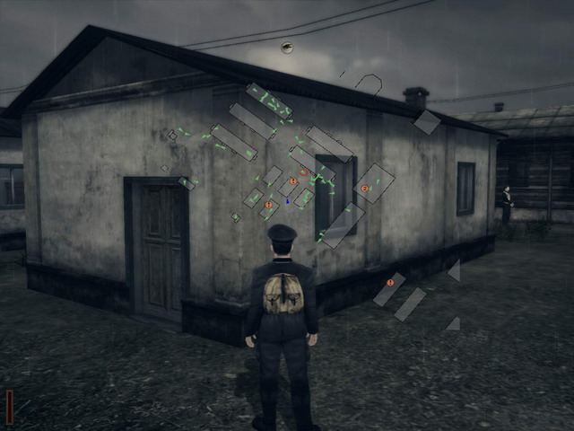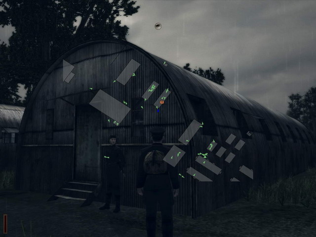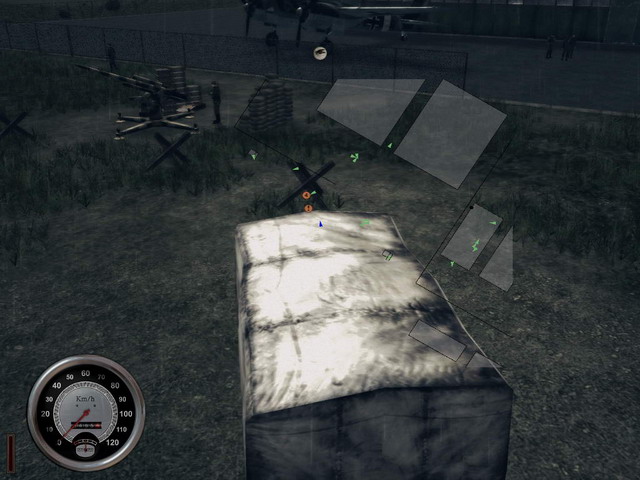 Шпионы народ любопытный. Поэтому отправляемся выяснять, что же скрывается под восклицательными знаками (подсказками), которыми отмечены два рядом стоящих здания на мини-карте. Идем в район бараков, что на другой стороне взлетной полосы. Один из двух отмеченных объектов медпункт. Нас интересует второй с закрытой дверью. Нужно взламывать, когда двое солдат (у домов слева и справа) не смотрят, а третий, что ходит вокруг медпункта, находится за зданием вне поля видимости (придется набраться немного терпения). Пробравшись в дом, обнаруживаем на стуле форму водителя в дальней комнате. Переодеваемся. Нам сообщат, что меня (водителя Ганса) ждут вместе с грузовиком у ангара с боеприпасами. Кладем форму офицера в наш немецкий рюкзак. |