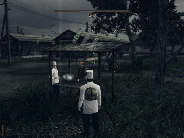 Окольными путями пробираемся в район зенитки (форма вызывает подозрение, похоже два повара на один чан чересчур). Останавливаемся около вышки, чтобы осмотреться. Нас интересует зенитка, а в первую очередь зенитчик и повар. Они с завидной периодичностью пристраиваются около большой кастрюли на столе. Как только около нее никого не окажется, мы быстренько подбегаем и подливаем слабительное в кастрюлю.