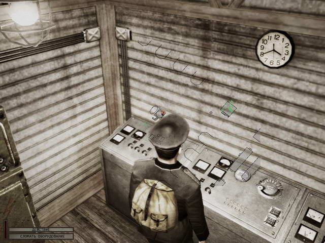 Ближе всего находится Диспетчерская вышка (метка №5), поэтому направляемся туда. С улицы по лестнице поднимаемся на второй этаж вышки. Заходим внутрь и обращаем внимание, что слева стоит передатчик. При удобном случае, когда все отвернутся, вызываем группу (передаем сигнал радисту). Не забываем, что время работает против нас! |