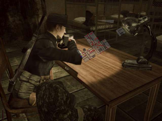 в первой миссии: фриц который выходит покурить из радарной, подошел к нему сзади, целюсь кинуть ножик, в этот момент он, испуганный моим топтом, приседает, брошенный нож ударяется об металические перила и по параболе летит обратно ко мне, я было даже испугался как бы он меня самого не убил, но нож, пролетев у меня над головой, вреда не причинил, а воткнулся в землю у меня за спиной...