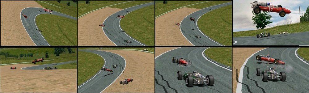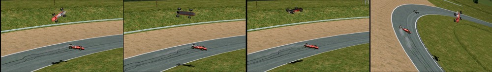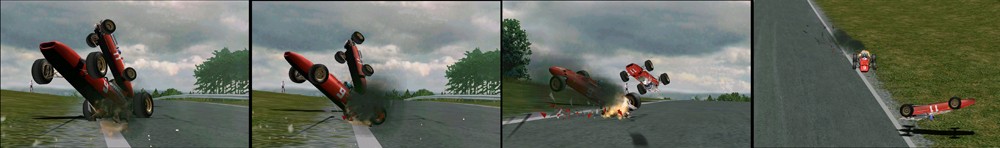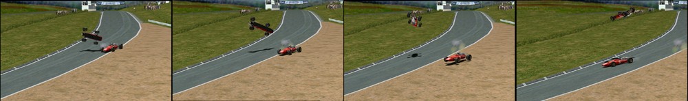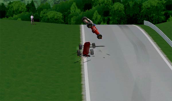 В следующую пятницу, в гонке на трассе Зандвоорт состоятся повторные запуски. Ученые воспользуются тем обстоятельством, что этап будет проходить в рамках девятого чемпионата российской лиги по ГПЛ 69. А это означает, что на Феррари 312 будут установлены крылья. Ученые надеются превзойти достигнутые результаты. Вот, что сказал пилот Феррари нашему корреспонденту: «А че, получилось оч даж нехило! На стартовой прямой я немного притормозил, что позволило запускающему использовать весь потенциал скорости своей машины. Мне показалось, что моя машина поднялась на огромную высоту, хотя по записям видно, что высота оказалась не такой большой. Совершив мягкую посадку, был выровнен вспомогательной машиной, после чего я подумал, что неплохо бы и повторить. Запускающий начал вместе со мной разгон, но для полета была маловата. И поэтому второй запуск прошел из рук вон никуда. Моя машина приземлилась в этот раз на крышу и о следующую попытку пришлось отложить до следующего этапа. А жаль». Ниже приводятся кадры полета. А здесь вы можете скачать полную запись полета http://www.webfile.ru/1158483.