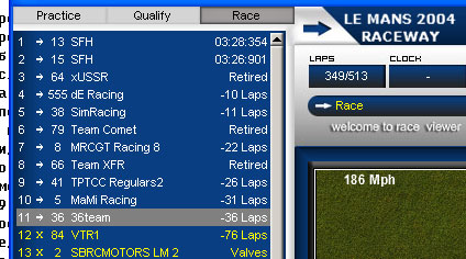 Расскажу вкратце что сейчас происходит. От нашего комьюнити выставленно три команды: ruGTP ET (DeniX, LICH, DenF1, Kokka), 36Team (Lookeron, inv, Gaus, JohnyF1) и xUSSR Team (я, Sergey Frolov (aka slotracer), Alex Solianin). Я ехал квалу и удачно ее провалил Стартовал 20м и к концу своей смены шел третьим. Далее заступил СФ и смог закрепиться на 4ом месте. После него стартовал Алекс, но сейчас опять едет Сергей. В общем зачете мы сохраняем 4ое место (-3laps). Детальнее опишу каждую свою смену после гонки Если не забуду У команды ruGTP ET возникли очень серьезные проблемы со связью и сейчас они идут на 12ом месте (-8 laps). 36Team идет на 16ом месте (-10 laps). Собственно все
