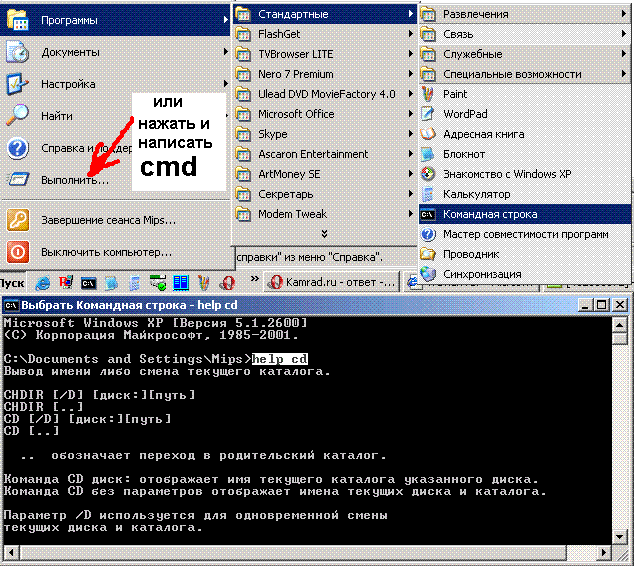 Нажимаешь Пуск, потом Выполнить, пишешь там cmd и нажимаешь Enter. Откроется черное окно. Это и есть командная строка.