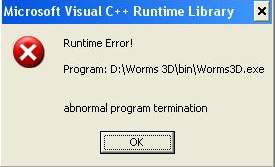 я разобрался с ентой ошибкой... вообщем все дело в мультике вступительном... логотип сеги... он просто запорчен сам по себе и када игра пытается его врубить она вылетает... вообщем лечим очень просто в папоче ...\Worms3D\Data\FMV лежат в открытом виде все мульты... просто киляем мульт с названием sega или че-то в ентом роде.. и все прекрасно работает |