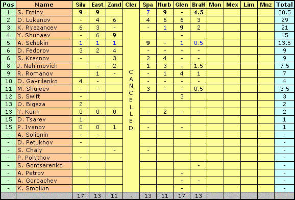 В результаты гонки внесено изменение. Juris Nahimovics65 получил свой штраф +60 сек. за Уоткинс-Глен и теперь переместился на пятую позицию вместо четвёртой. Обновлённые таблицы будут к итогам этапа в Монако.