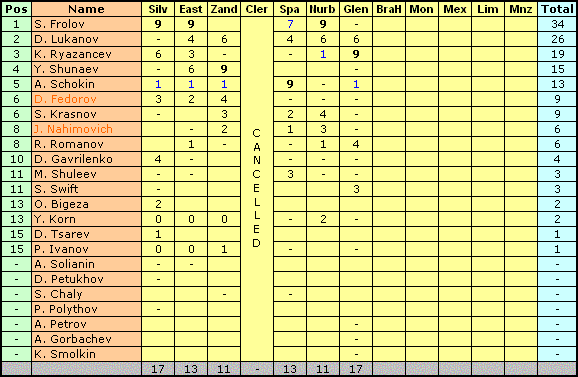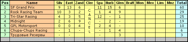 PRACTICE TIMES Pos No Driver Team Nat Time Diff Laps 1 12 Alexandr Schokin65 Lotus JPN No time No time 0 2 8 Sergey Frolov Lotus MON 1m08.997s 22 3 17 Kostya Ryazancev65 BRM BRA 1m09.023s 00.026s 25 4 16 Dmitry Lukanov Lotus NZL 1m09.586s 00.589s 23 5 10 Swetlan Swift_65 BRM VEN 1m09.619s 00.622s 10 6 7 Dmitry Gavrilenko Lotus GER 1m09.824s 00.827s 16 7 18 Alex Petrov65 Ferrari USA 1m09.935s 00.938s 13 8 9 Roman Romanov65 Ferrari RSA 1m10.067s 01.070s 21 9 13 Den Fedorov Brabham USA 1m10.127s 01.130s 17 10 1 Yegor Shunaev BRM VEN 1m10.641s 01.644s 11 11 11 Artem Gorba4ev65 BRM GER 1m10.718s 01.721s 22 12 20 Juris Nahimovics65 Lotus SPA 1m10.826s 01.829s 8 13 2 Maxim Shuleev65 Brabham GER 1m10.845s 01.848s 21 14 15 Pavel Ivanov Honda CAN 1m10.852s 01.855s 21 15 6 Yury Korn Ferrari GBR 1m11.015s 02.018s 19 16 14 Sergey 65 BRM GER 1m11.257s 02.260s 11 17 3 Kokka Smolkin Brabham SUI 1m11.459s 02.462s 21 Старт приняли 17 пилотов, а вот пересечь финишную линию удалось лишь троим. 17,6% доезжаемости - такого давненько не видели... Официальные результаты гонки: RACE RESULTS (After 33 laps) Pos No Driver Team Nat Laps Race Time Diff Problem 1 17 Kostya Ryazancev65 BRM BRA 33 38m22.477s +9 pts 2 16 Dmitry Lukanov Lotus NZL 33 38m59.929s 37.452s +6 pts 3 9 Roman Romanov65 Ferrari RSA 32 38m34.336s 1 lap(s) +4 pts 4 10 Swetlan Swift_65 BRM VEN 27 32m08.288s 6 lap(s) +3 pts 5 13 Den Fedorov Brabham USA 19 22m52.853s 14 lap(s) +60 sec 6 7 Dmitry Gavrilenko Lotus GER 16 19m37.190s 17 lap(s) 7 11 Artem Gorba4ev65 BRM GER 6 7m37.882s 27 lap(s) 8 15 Pavel Ivanov Honda CAN 4 4m56.899s 29 lap(s) 9 18 Alex Petrov65 Ferrari USA 3 3m41.274s 30 lap(s) 10 1 Yegor Shunaev BRM VEN 1 1m43.893s 32 lap(s) 11 8 Sergey Frolov Lotus MON 0 0m00.000s 33 lap(s) +1 pt 12 20 Juris Nahimovics65 Lotus SPA 0 0m00.000s 33 lap(s) +60 sec 13 2 Maxim Shuleev65 Brabham GER 0 0m00.000s 33 lap(s) 14 14 Sergey 65 BRM GER 0 0m00.000s 33 lap(s) 15 6 Yury Korn Ferrari GBR 0 0m00.000s 33 lap(s) 16 3 Kokka Smolkin Brabham SUI 0 0m00.000s 33 lap(s) 17 12 Alexandr Schokin65 Lotus JPN 0 0m00.000s 33 lap(s) RACE FASTEST LAPS Pos Driver Time Lap 1 Kostya Ryazancev65 1m09.244s 32 2 Swetlan Swift_65 1m09.978s 27 3 Dmitry Lukanov 1m10.045s 24 4 Roman Romanov65 1m10.453s 17 5 Dmitry Gavrilenko 1m10.509s 4 6 Den Fedorov 1m10.698s 18 7 Alex Petrov65 1m11.442s 2 8 Pavel Ivanov 1m11.671s 2 9 Artem Gorba4ev65 1m12.076s 4 10 Yegor Shunaev 1m39.528s 1 11 Maxim Shuleev65 No time 12 Sergey 65 No time 13 Sergey Frolov No time 14 Kokka Smolkin No time 15 Yury Korn No time 16 Juris Nahimovics65 No time 17 Alexandr Schokin65 No time Теперь о штрафах. Следующие пилоты: A. Petrov S. Krasnov K. Smolkin M. Shuleev J. Nahimovich Получают предупреждение за неоднократное использование чата не по назначению во время гонки. 1. Стартовый завал. Тремя голосами против двух виновных в завале не выявлено. 2. Поведение J. Nahimovich на первом круге гонки на прямой к Loop. Четырьмя голосами против одного Юрий признан виновным в сходе Лича вследствие этого момента. Юрий получает отложенный штраф +60 секунд. 3. Инцидент S. Swift - S. Frolov. Большинством голосов эпизод признан гоночным инцидентом. 4. Инцидент D. Gavrilenko - A. Gorbachev. Голоса разделились между виной первого, второго и гоночным инцидентом. Так как голосов за два варианта поровну (по два), здесь без наказаний. 5. Инцидент D. Fedorov - A. Petrov. Всеми голосами признана вина Дена. Ден получает отложенный штраф +60 секунд. Касательно команд, которые так и не проголосовали по инцидентам - Трудовые Резервы и SF Grand Prix. Согласно пункту 8.3 Регламента, всем пилотам этих команд могут быть не начислены очки на следующем этапе. Тем не менее, несмотря на злостное уклонение данных команд от вынесения судейских решений, в данный момент ограничимся строгим предупреждением. В случае, если указанные команды снова не исполнят свой судейский долг на очередном этапе, пилоты этих команд будут сняты с этапа. Таблицы чемпионатов. Личный зачёт: Last edited by Dewrat; 03-04-2005 at 09:54. |