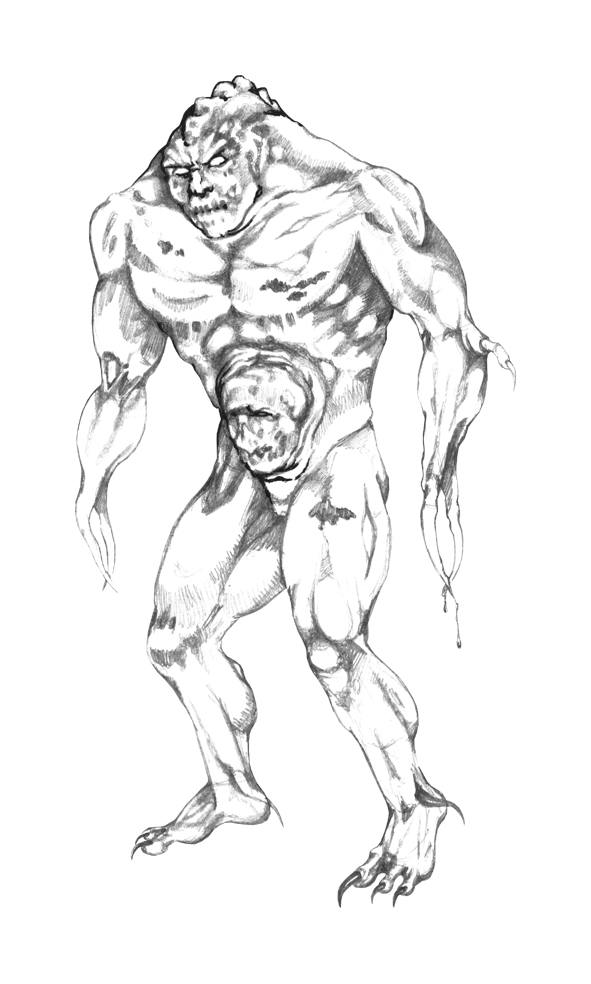Автор: Jahar&Superhero 1.Подробное описание внешнего вида монстра. Человекообразный высокого роста около 2-х метров Позвоночник имеет серо-коричневый окрас, глаза без зрачков желто-зеленого цвета. В результате неопределённой мутации у Позвоночника до предела оптимизированная мышечная масса. В некоторых участках тела имеются язвы. Кожа грубая, в области брюшной полости имеется отросток в виде недоразвитой человеческой головы. Шеи не имеет, не способен свободно вращать головой, т.к. она срощена с торсом. Выше лба, в голову врощен массивно выступающий хребет, который идет вдоль всей спины как у человека. (от сюда и название) Ушные раковины отсутствуют, вместо них по бокам головы ушное отверстие. Пальцы с большими острыми когтями имеет только на ногах, - три фаланги, на руках пальцев нет, вместо них от кистей расходятся массивные костные наросты напоминающие клещи, которые используются непосредственно, как оружие. В области локтей имеет отростки в виде отрофированных пальцев с когтями. Позвоночник - гермофродит, и не имеет способности размножаться. Мышцы монстра укрепленные благодаря неопределённым мутогенным воздействиям радиации, дают возможность созданию обладать недюжей физической силой. 2.Подробное описание способа передвижения монстра. Т.к Позвоночник это подвергшийся мутации человек, то скорость и ходьбы и бега мутанта практически как у человека, соответствующего роста. При виде жертвы благодаря развитой мускулатуре, способен прыгать на дистанцию до 5-ти метров. 3.Подробная информация о повадках создания, местах его обитания. Обитает в помещениях, с малым освещением, т.к врезультате радиационного воздействия глаза монстра чувствительны к яркому свету, который способен ухудшать зрение, и раздражающе воздействовать на Позвоночника. Позвоночник находится в постоянном поиске пропитания, и в пищу способен употреблять всё живое с чем может справится. Охотятся и живут позвоночники по одиночке, при виде чего либо живого(еды) приходят в ярость, и немедленно атакуют. Мозг у Позвоночника практически полностью отрофирован, и он не способны логически мыслить, и соизмерять силы противника, поэтому может с легкостью напасть на существо крупнее и сильнее себя, не задумываясь о последствиях. Мутант не осознает своих действий, ибо им движет только чувство голода, сопровождающееся жудкой болью в областе желудка. 4.Подробная "легенда" монстра. Как и было сказано выше, позвоночник - это мутировавший человек, скорее всего, это могли быть люди из научного персонала или охраны, оказавшиеся неподалёку от эпицентра взрыва во время последней катострофы, в результате чего и подверглись необъяснимым мутогенным процессам, которые вызвали наростание огромной мышечной массы, разорвавшей одежду. Однако ходят слухи, что где то в недрах зоны существует аномалия, которая и превращает людей в этих злобных обезумевших монстров. Однажды был случай когда трое сталкеров отправились в глубь зоны, спустились в ранее не изведанные катокомбы, пройдя несколько километров по подземным коммуникациям, и изрядно устав от нервного напряжения и разбирания бесконечных завалов, решили сделать привал, чтобы поесть и отдохнуть, все было вроде тихо, когда один из приятелей поднялся и сказал что пойдет за угол справить нужду, когда он скрылся в тени, двое услышали странный ч