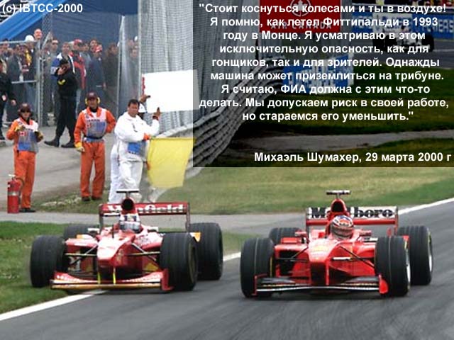 Съезжать на обочину при старте категорически недопустимо. Бурти, например, как раз справа его пытался обойти. Самое разумное - просто ехать прямо. А вот годом ранее, в 2000-м, всё в том же Хоккенхайме, было куда любопытней. Михаэль так отчаянно вилял на старте, со своими любимыми подрезаниями, что в результате такой подрезки "собрал" Физикеллу (которому в качестве альтернативы опять-таки предлагалось выехать на траву), вместе с которым и вылетел перед первым поворотом, на 250+. После чего размахивал руками, недовольный видимо тем, что ширина машины Физико оказалась 1,8 м, а не 0,5. |