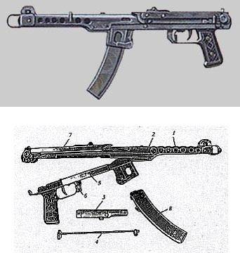 По принципу действия пистолет-пулемет относится к образцам автоматического оружия со свободным затвором.Как и у ППШ-41, масса затвора и сила возвратно-боевой пружины находятся в таком соотношении с массой пули, длиной ствола и давлением пороховых газов, что в момент выстрела обеспечивается надежность запирания канала ствола без специального запирающего механизма.Пистолет-пулемет ППС-43 предназначен только для автоматического огня, так как переводчика на одиночный огонь он не имеет. Однако натренированный стрелок в случае необходимости может производить одиночные выстрелы, освобождая спусковоп крючок сразу же после нажима на него для выстрела.Прицельные приспособления состоят из мушки и прицела с поворачивающимся целиком. Целик рассчитан на дальности 100 и 200 м. в соответствии с чем на целике поставлены цифры 10 и 20. Убойную силу пуля пистолета-пулемета сохраняет на дальности до 800 м. Наилучшие результаты обеспечиваются при стрельбе короткими очередями (2-5 выстрелов). При стрельбе длинными очередями (15-20 и более выстрелов) рассеивание увеличивается. Для улучшения кучности стрельбы пистолет-пулемет в дульной части имеет компенсатор, который одновременно является и дульным тормозом.Компактность конструкции пистолета-пулемета обеспечена за счет использования откидного металлического приклада. Сложенный на ствольную коробку в походном положении металлический приклад в боевом положении откидывается и заменяет собой обыкновенный приклад. В случае отсутствия времени на откидывание приклада (при внезапном нападении противника) благодаря наличию пистолетной рукоятки стрельбу можно вести с достаточной точностью и при сложенном прикладе.Питание патронами пистолета-пулемота ППС-43 производится из секторного магазина емкостью 35 патронов. Вес ППС-43 с полным запасом патронов (шесть снаряженных магазинов) составляет 6,72 кг, что меньше веса пистолета-пулемета «Суоми» с одним магазином.Для предотвращения случайных выстрелов ППС-43 имеет предохранитель, представляющий собой фигурную пластинку, располагающуюся вдоль правой внутренней стенки спусковой коробки. Во включенном положении предохранитель стопорит спусковой механизм и блокирует затвор.Легкий, портативный и безотказный в действии пистолет-пулемет ППС-43 особенно хорошо подходил для вооружения разведчиков, десантников, членов экипажей бронемашин. Вооружались им и солдаты стрелковых подразделений. ППС-43: 1 - ствол; 2 - ствольная коробка; 3 - затвор; 4 - возвратный механизм; 5 - спусковая коробка; 6 - предохранитель; 7 - приклад; 8 - магазин. |
