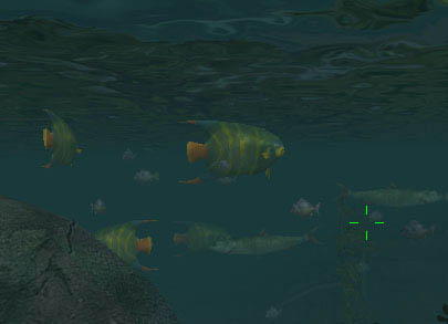 Во время плавания герой находился в маске или нет? см.скрин. Если на улице день, то по поверхности это не заметно - уж больно темновато. Толща воды выглядит нормально, а вот сама поверхность подкачала - нет игры света на ней. Чуть - чуть посветлее в верхних слоях, а в глубь - потемнее - и тогда будет супер (мое субъективное мнение). Кстати, а рыб не многовато? И где пузырьки воздуха? |