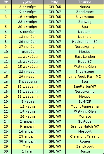 10 стандартных трасс в 67-ом и 10 - в 65-ом. После долгих раздумий, я всё-таки убрал Монако из 67-го - уж больно на него жаловались от чемпионата к чемпионату, а в 65-ом оно куда лучше и приятнее рулится. Хотя, конечно, если народ будет против, то... По 5 аддонов в каждом чемпионате. Для 67-го это Ле Ман Сарте, Хоккенхайм 67 и Роад 67 (всё это трассы, идеально годящиеся именно для 67-го), а также Лайм МС и (куда уж без него!) Солитуд. Для 65-го это Маунт Панорама, Кеймола, Брэндс-Хэтч'67 (на котором в 65-ом и 67-ом проводились Гонки Чемпионов), Снеттертон (который до 64-го года включительно регулярно принимал у себя внезачётные гонки Ф1) и Isle of Man. Думаю, все эти трассы должны быть на сервере. При составлении я постарался учесть пожелания. Высказывайте свои замечания по нему: |
