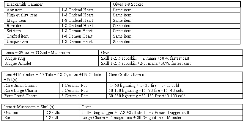 --- Ethereal Items + R32 Cham + Blacksmith Hammer + Anvil = same item (indestructible) Useful Recipes: =============== Any Book (Auric/Summoning/Masteries) +Scarab = Random magic of same type Any Book (Auric/Summoning/Masteries) +Scroll for same book = Random Book +l level (up to level 20) Rune + Greek Runes + Mercury Pot = Extracted Runes Set + Emerald = set of the same type 3 Rare rings + Ceramic Pot + Skull = Unique ring 3 Rare Amulet + Ceramic Pot + Skull = Unique Amulet 3 Unique rings = Unique Amulet 3 Unique Amulet = Unique Ring 3 rare rings = rare amulet 3 rare Amulet = rare ring Low Quality Weapon + Blacksmith Hammer -> Normal Weapon Normal weapon + Blacksmith Hammer + Anvil -> Hi quality weapon Low Quality Armor + Blacksmith Hammer -> Normal Armor Normal Armor + Blacksmith Hammer + Anvil -> Superior Armor ---------------------------------------------------------------------- End of Recipe List - The Fury Within v1.02 ---------------------------------------------------------------------- |