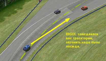 RM, этот манёвр физически не осуществим по одной простой причине - чтоб проехать по этой жёлтой траектории нужно изрядно сбросить газ (и 33-ий бы далеко вперёд уехал так). К тому же "встретились" то они вообще после 100метров далее за поворотом (при том что газ не сбрасывал VIP) |