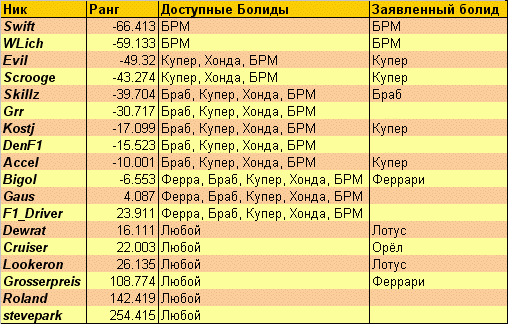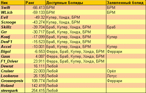 КАК? Не давать им пароль сервера. Могу согласиться. Но тогда с правилом КБ7 (Купер+Брэбхэм) или как? И фиксировать ли раз выбранную машину на весь сезон? Да наверное лучше с КБ7 за подиум, но машину не фиксировать. ЗЫ. Табличку с распределением пилотов по болидам тоже наверное нужно будет на сайт выложить... |