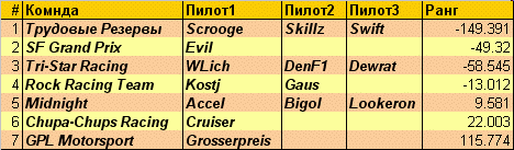 п.5.4 - я против 60% гонок. Откидываются обычно 2, ну 3. но почти половина - это нонсенс. Даже если в 67 году так и было - имхо не лучший стимул для борьбы в лиге. п.7.12 - за остальные нарушения могут налагаться различные штрафы, от предупреждения до реклассификации, по решению администрации и апелляционной комиссии. Составы команд - ![]() |