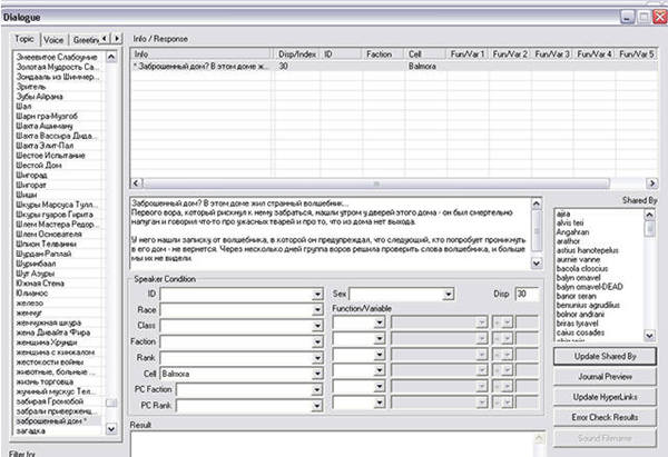 Поясните мне пожалуйста, что значит открыть файл-плагин как активный и что нам это даёт.... КС в него сохранять все изменения будет у меня вопрос по диалогам.. Делаю новый диалог, в условиях указываю, что он должен быть у всех жителей Бальморы, чье отношение ко мне 30 и лучше.. потом жму "Update shared by" , потом "Ок" и тишина.. ни у одного непися в Бальморе диалог не появился (относятся ко мне все >50) что я делаю не так? |