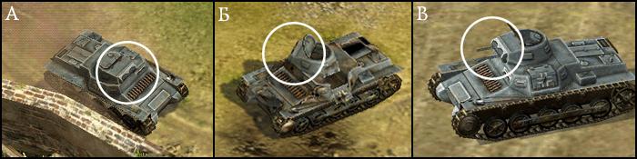 Изображения 'А' и 'Б' игровые (версия 1.12). Изображение 'В' с официального сайта. Как видно на скриншоте с сайта у модели легкого танка Рz-Ib на башне установлены 2 пулемета, однако, у игровой модели пулеметы отсутствуют... |