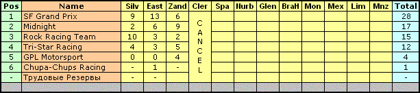 RACE RESULTS (After 27 laps) 1. Y. Shunaev - 9 pts 2. D. Lukanov - 6 pts 3. D. Fedorov - 4 pts 4. S. 65 +1 lap - 3 pts 5. N. Chat +1 lap - 2 pts 6. P. Ivanov +1 lap - 1 pt 7. Y. Korn +1 lap - 0 pt A. Schokin +1 pt Я бы назвал их "хер-официальными", ибо вопрос по штрафу пилота S. 65 блестящей инициативой боссов команд так и не решён, а со штрафом он перемещается на седьмое место вместо четвёртого. Сказать, кто выиграл поул, мне так никто и не удосужился, поэтому я выискал это в статистике highest climber. Кто такой по имени-фамилии N. Chat - я вообще опять забыл. Может пора под своими именами ездить, а то как в таблицу ваши результаты вносить, уважаемый? |