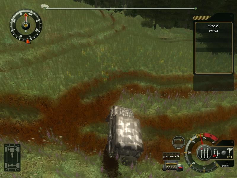 Запустил первый раз: поехал и врюхался в месте, где подряд идут три грязевых ванны. Запустил второй раз и ездил так, как ездил бы в жизни, сел всего дважды... Один раз тут, правда на заднем приводе: |