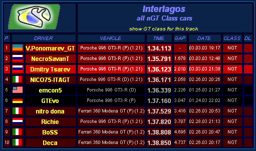 ![]() Brasil 996GT3 (P), wheel, no helps 1. 0.24.259 2. 1.16.752 F. 1.41.355 всё....устал... ![]() |
