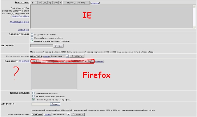 Народ, у кого Firefox стоит? У меня на форуме в меню ответа не работает ни одна кнопка, а кнопки "цитата" вообще нет. В IE все нормально...