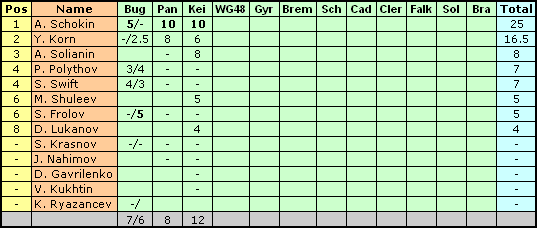 1. A. Schokin (29 laps) - 10 pts 2. A. Solianin (29 laps) - 8 pts 3. Y. Korn (28 laps) - 6 pts 4. M. Shuleev (27 laps) - 5 pts 5. D. Lukanov (26 laps) - 4 pts Официальная таблица чемпионата. Лич, похоже, всерьёз вознамерился выиграть его: |