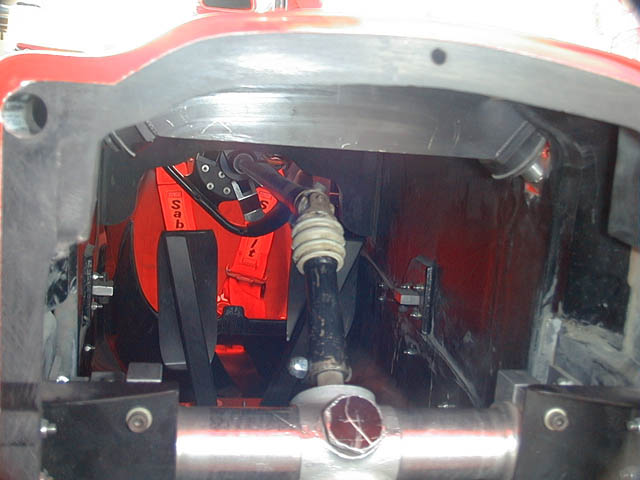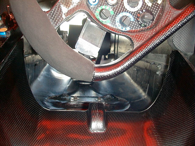 Вид в кокпит через носовой конус. На переднем плане рулевая рейка, вверху элементы подвески, дальше - педали и руль.