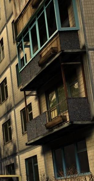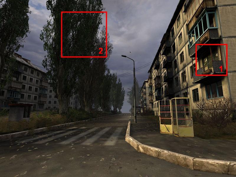 Внимание на содержимое рамки под номером 1: видите, странный цвет стекла - зеленоватый с белыми пятнами. Не похоже ли это на отражение деревьев и куска неба в части скриншота, обведённой рамкой №2? Если да - то я сойду с ума... А если нет, тогда привожу доводы в пользу первого предположения: это - не текстура, это - единственное застеклённое окно в здании, это - не содержимое лоджии за окном (скорее всего). Впрочем, есть и сомнения: отражение слишком чёткое - должны быть видны зёрна (тексели) текстуры (не raytracing же они используют!), да и плохое качество разделительной полосы указывает на большой возраст скриншота (я думаю, для тогда эти эффекты были только в мечтах). Итак, смотрите, делайте предположения... Может быть, я не прав и просто ослеп? Конечно, если это не является отражением, никто не потеряет интереса к игре, но всё-таки...