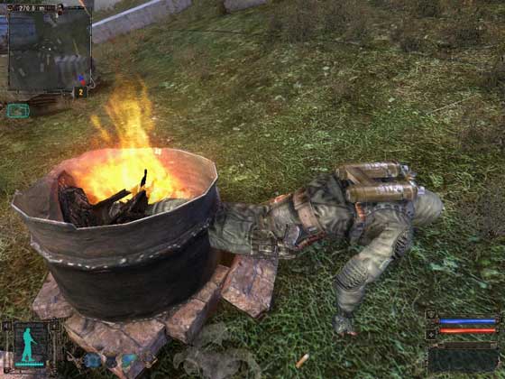 Пожалуйста, сделайте так, чтобы сталкеры не респаунились внутри пылающих бочек. А то они рождаются и мгновенно погибают. А потом геймер наблюдает картину: в бочке жарится сталкер, а его кореша сидят вокруг, жрут колбасу и весело травят анекдоты. Зрелище не для слабонервных. А это вообще ужоснах какой-то, симбиоз бочки с человеческой плотью - ноги в огне, а остальное торчит снаружи. Да еще и мерзко дрыгается, издавая отвратительный звук.