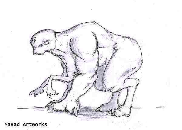 Да, рисунок не оттуда. Это факт. А по описанию уже реальнее немного и проще, чем Громыхало. В всяком случае, такой "биологический танк" уже по настоящему опасен. На дерево от него не спрячешься (поавлит), в избушке не укроешься (дверь али стену вышибет).