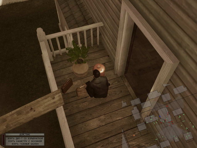 Затем затащить этот труп по той же доске в комнату, и прихватить одну из 3 вещей: газовый баллон, "дипломат" со взрывчаткой или канистру с бензином. Вот что будет в руках, - тем и устраивается пожар (ещё один мультик) |