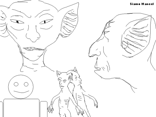 Лицо: Крупные выпученные глаза, однако, вырез глаз узкий, как у засыпающей кошки. Нос длинный, крючком, Уши большие, заостренные назад и вверх, сравнимы с размерами черепа. В ушах несколько горизонтальных мембран, видимо, для улучшения слуха. Губы сжатые, невыразительные, зубы практически человеческие.