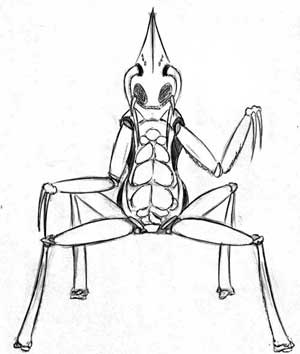 Автор: Lindar 1.Подробное описание внешнего вида монстра. 1. Тело с аэродинамическими очертаниями, хитиновым покровом. Внешне напоминающее здорового кузнечика с мордой странной и тупой собаки. Размер взрослой собаки крупных пород. Окрас песочный+хаки+черный, на ногах у некоторых самцов могут встречаться желтые участки. 2.Подробное описание способа передвижения монстра. 2. ----Доберман степей и узких коридоров----. -в режиме прыжковой атаки развивает большую скорость, постоянно отталкиваясь двумя парами задних ног -в режиме ближнего боя передняя часть тела стает вертикально, опираясь на две пары задних ног и выставляя вперед передние - боевые, в таком варианте высота может достигать чуть более полутора метров. -очень туго с поворотами на скорости - атака на скорости практически линейна, разворачивается, только на месте или в режиме ходьбы без прыжков. 3.Подробная информация о повадках создания, местаз его обитания. 3. Обитает стаями. В стае 4 макс. 6 семей. Самки лишены атакующих клыков и не охотятся, без самцов являются легкой жертвой. Имеет привычку обосновываться в домах с запасным выходом,часто созданным лично. Охотящихся можно найти и на открытом пространстве (степь, холмы). Если добыть еду становиться проблемной - стая снимается с места и мигрирует в поиске более питательных районов. 4.Подробная легенда монстра. 4. Легенда: опять все та же радиация и аномалии, под влиянием которой простые крупные собаки начали из поколения в поколение обзаводится жесткой броней, а насекомые увеличиваться в размерах и питаться плотью. На определенном этапе формировались комбинированные стаи, еще позднее грань между ними стерлась. 5. Подробная информация о способах взаимодействия монстра с другими персонажаим зоны. 5. Пытаются не входить в конфликты с явно более сильными врагами, предпочитают группой "задолбить" одного, впрочем от голода или в ярости могут бросится на кого угодно. Лакомая добыча, одинокая "плоть" или "подгулявший" сталкер. Развита иерархия - в стае есть вожак. Могут действовать в любое светлое время суток. С приходом ночи зрение резко ухудшается и стая предпочитает отдыхать. 6.Подробная информация о боевой тактике монстра, о том, как он ведёт себя во время взаимопротивостояния с врагом. 6. Атака начинается издалека, предпочтительно из-за спины жертвы. Стая атакует веером с углом 30-40 градусов (если на открытой местности), если в помещении - предпочтительно в коридоре, то только с одной его стороны (чтоб своего не завалить). Следует обратить внимание на строение челюсти - оно изменяемое - в режиме быстрой атаки центральные клыки торчат четко вперед, в надежде впиться в район позвоночника и изменением конфигурации челюсти сломать его быстро. Даже удавшаяся атака не в позвоночник наносит серьезные повреждения. Первым атакует вожак, за ним сильнейшие в стае, при неудачной скоростной атаке (промах по жертве, обнаружившей атаку) атакующий бежит дальше на несколько метров и только там начинает разворачиваться. Если быстро завалить жертву не удалось следует фаза ближнего боя - подъем на задние лапы и атака передними, движение может изменятся как от ходьбы на задних, так и до мелких прыжков - чтобы добраться до жертвы. При потере вожака либо большей части атакующих, стая сворачивается и сваливает.... 7. Подробная информация о том, как боротся с монстром, 